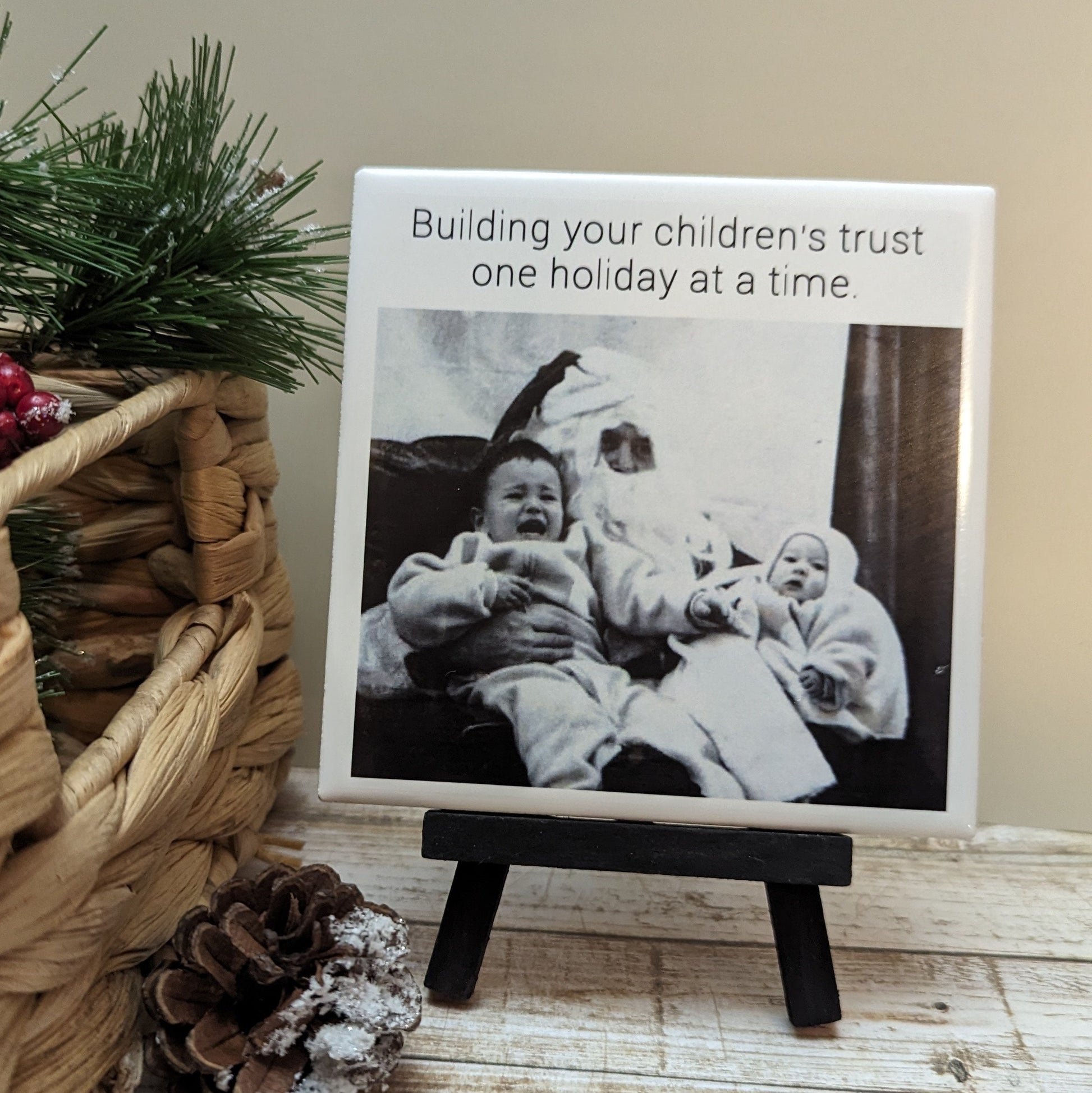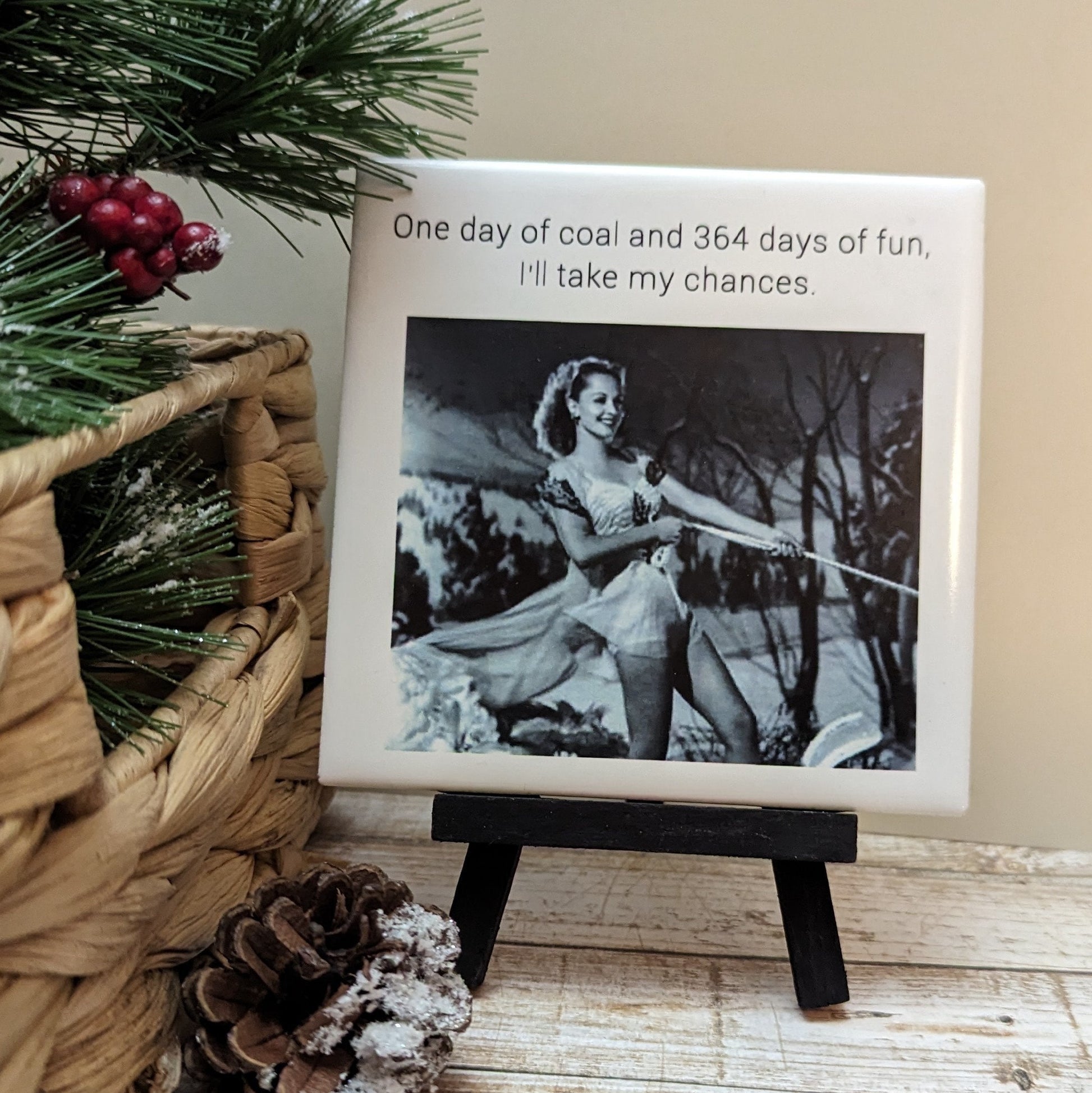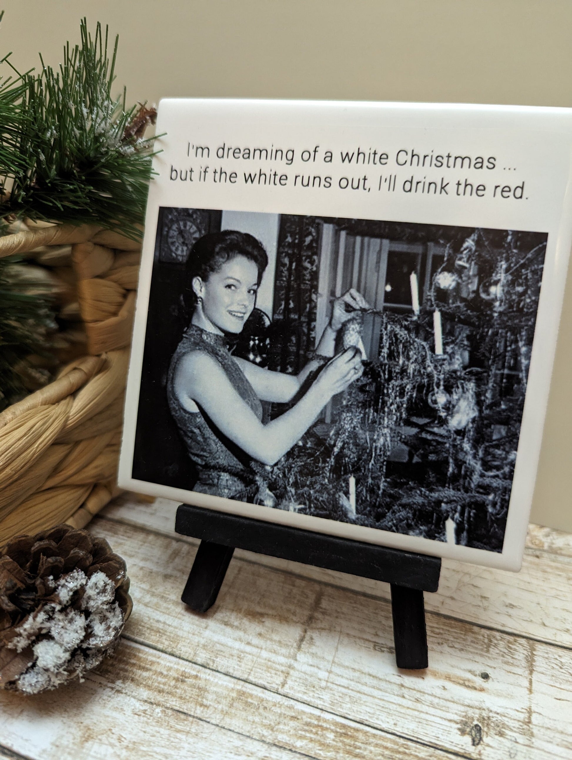 For all of the wine lovers out there. Whether you prefer red or white, our funny Christmas wine signs have a vintage image with a snarky comment below. Great for gifting or even for yourself. They're ceramic and measure just over 4". Your choice of black or natural easel (included)