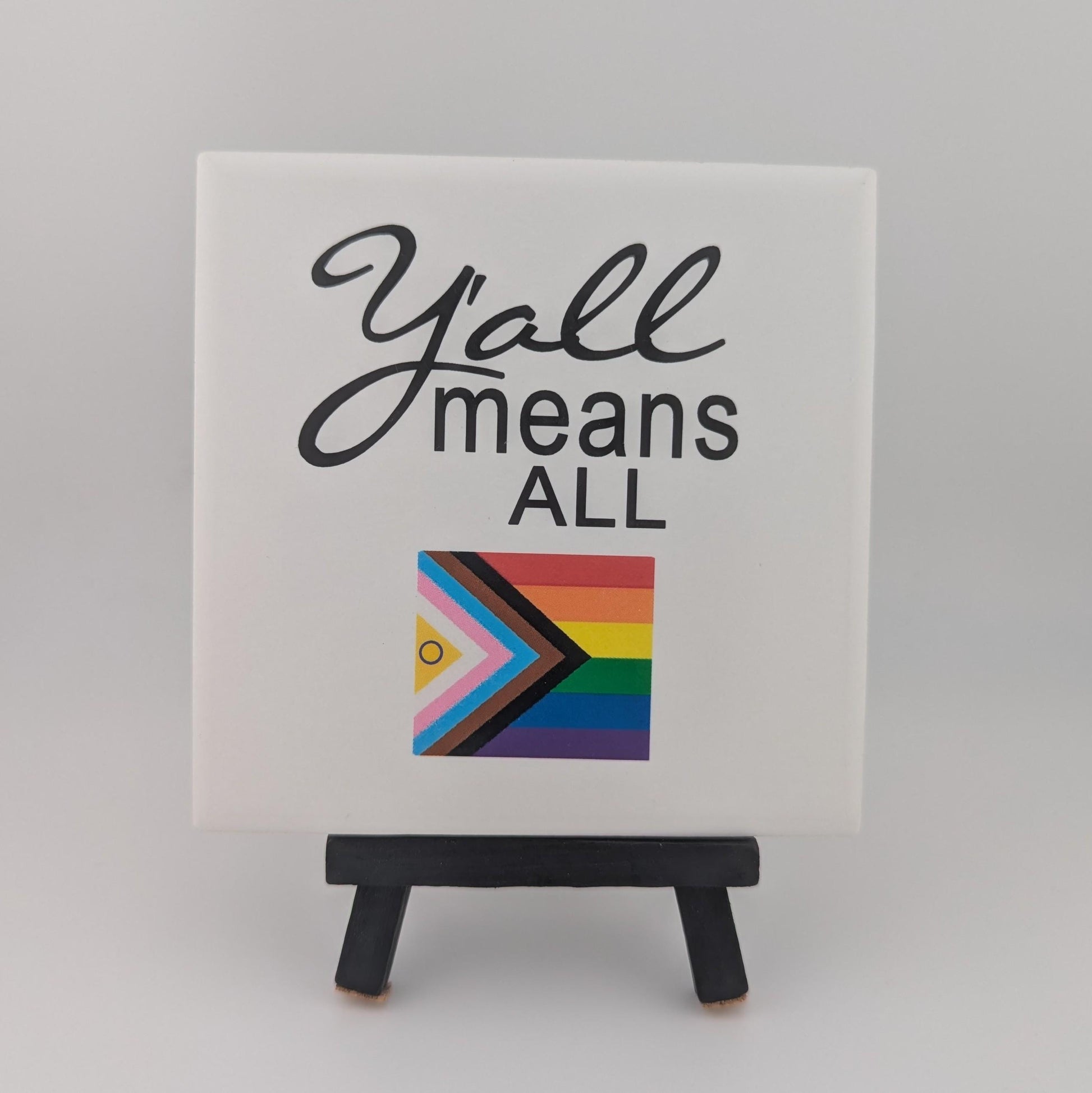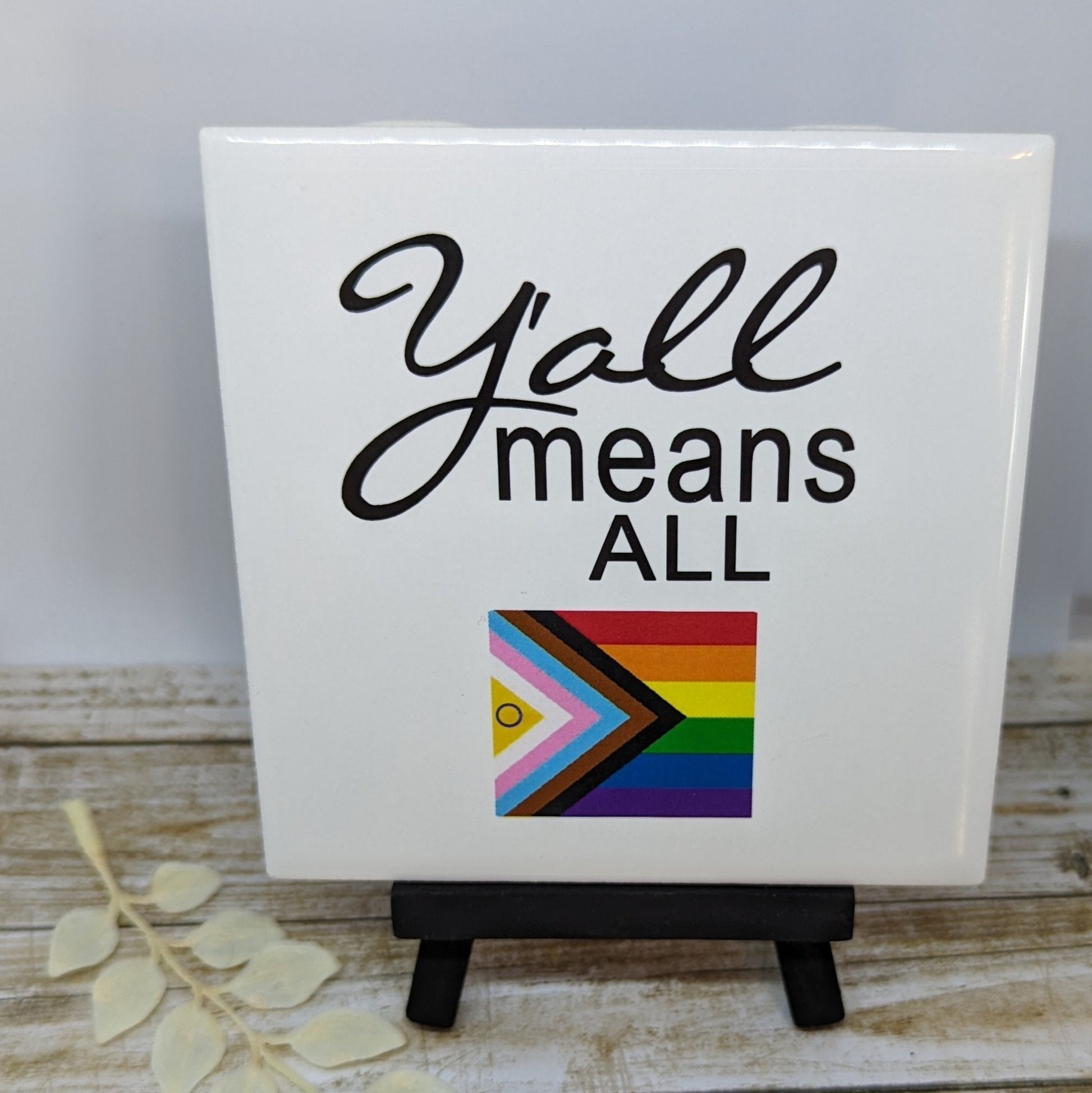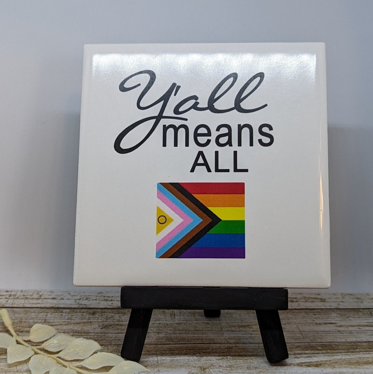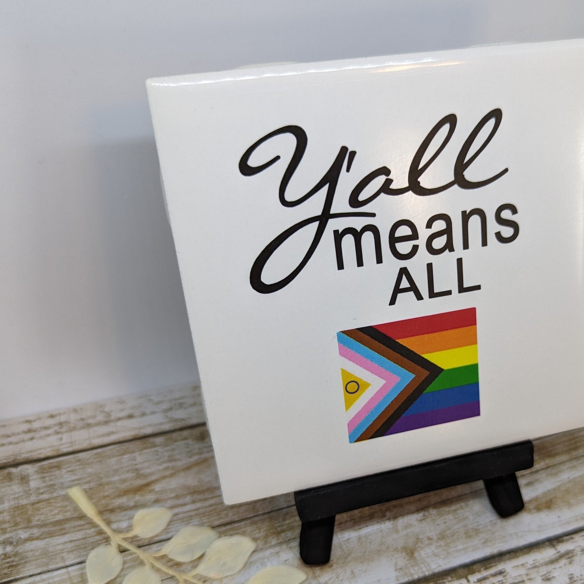 Welcoming and inclusive pride signs with a southern touch. Our Y'all means All signs are made of ceramic and come with your choice of black or natural easel (included). Its small size makes it perfect for an entryway, centerpiece or even a desk. Great for gifting as well and can be shipped directly to the recipient.
