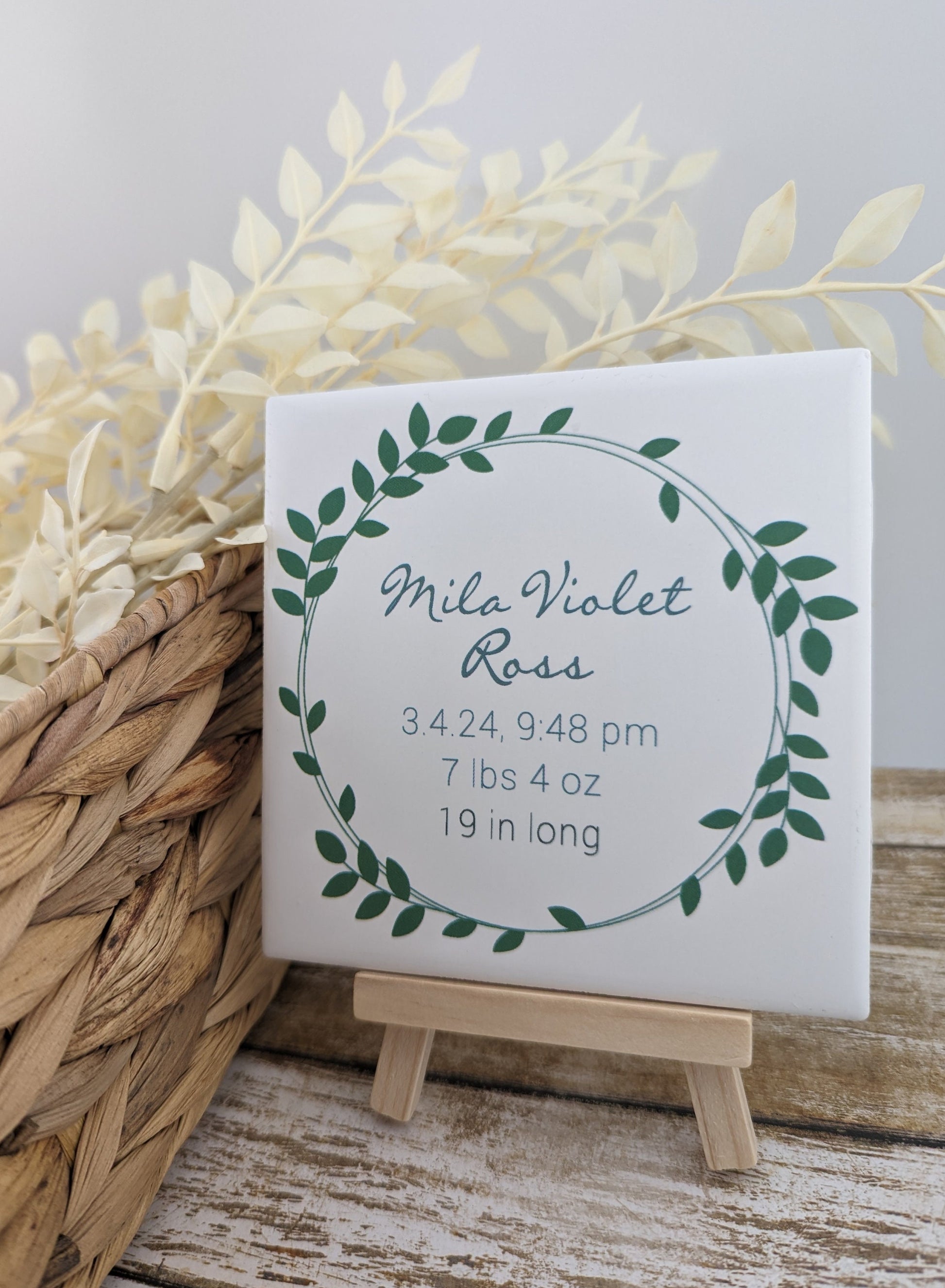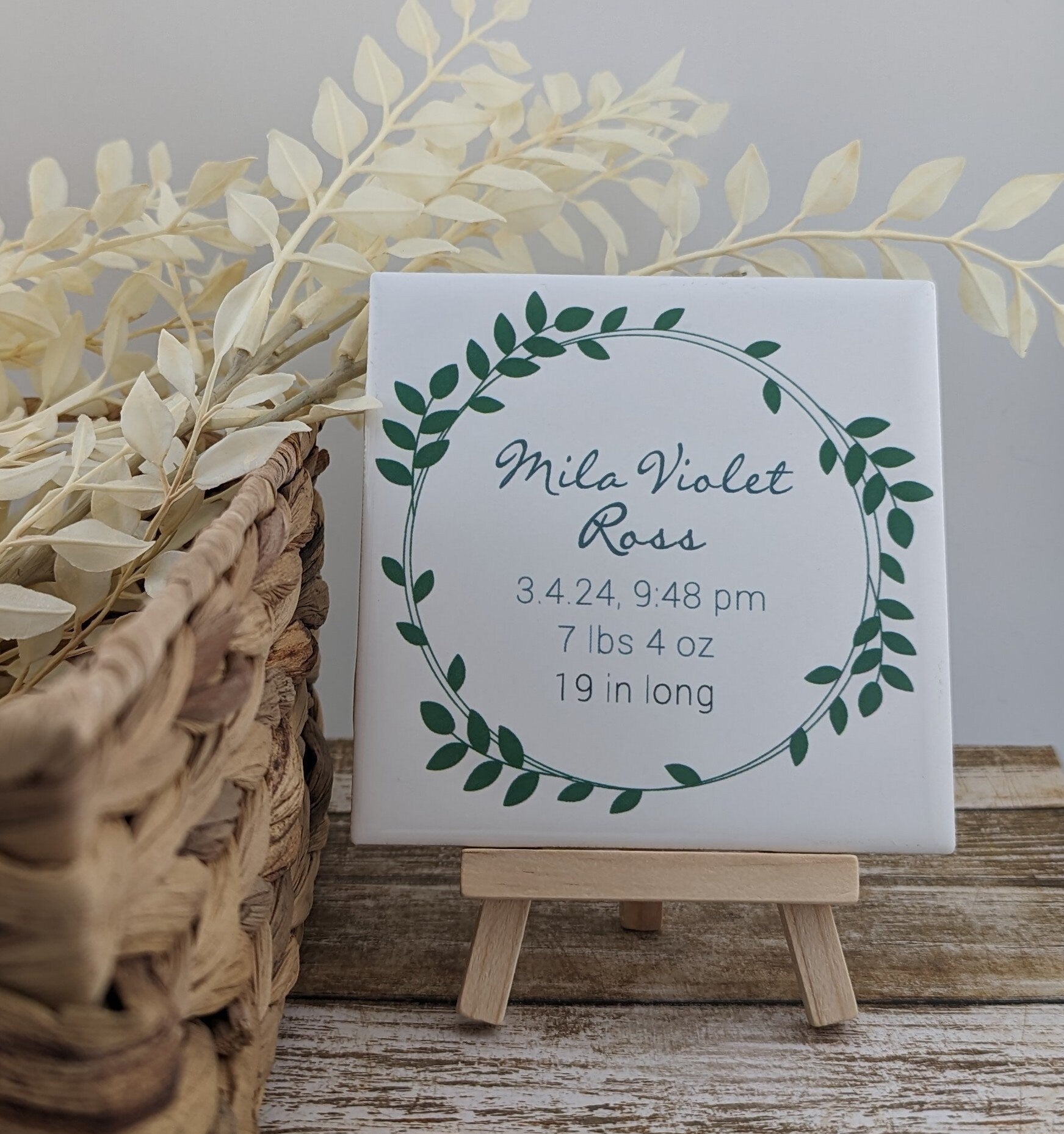 Welcome to the world little one! Our ceramic easel signs are personalized with baby's name and birth info surrounded with beautiful leaf border. These make excellent Baby Shower gifts. Your choice of black or natural easel (included)