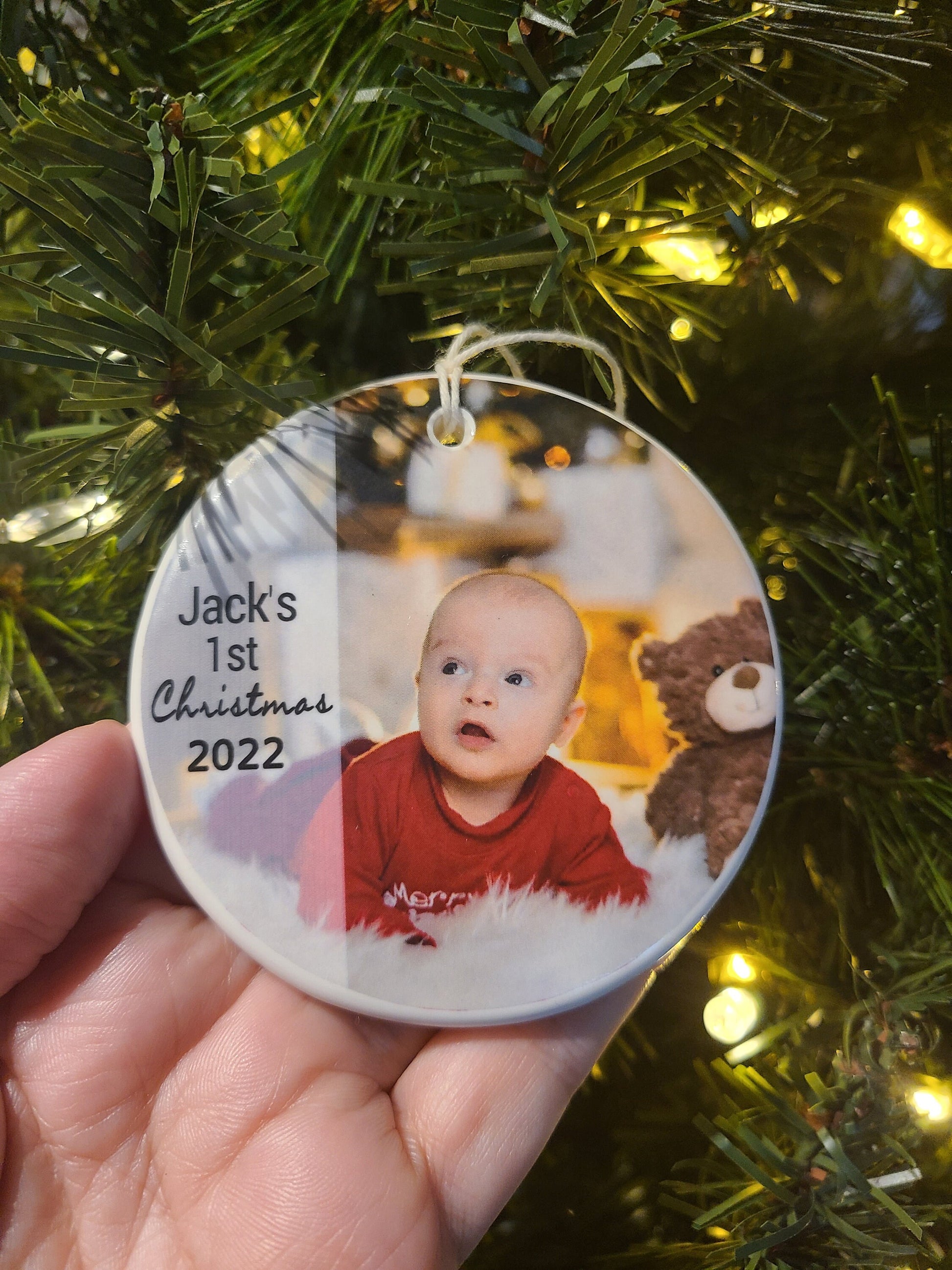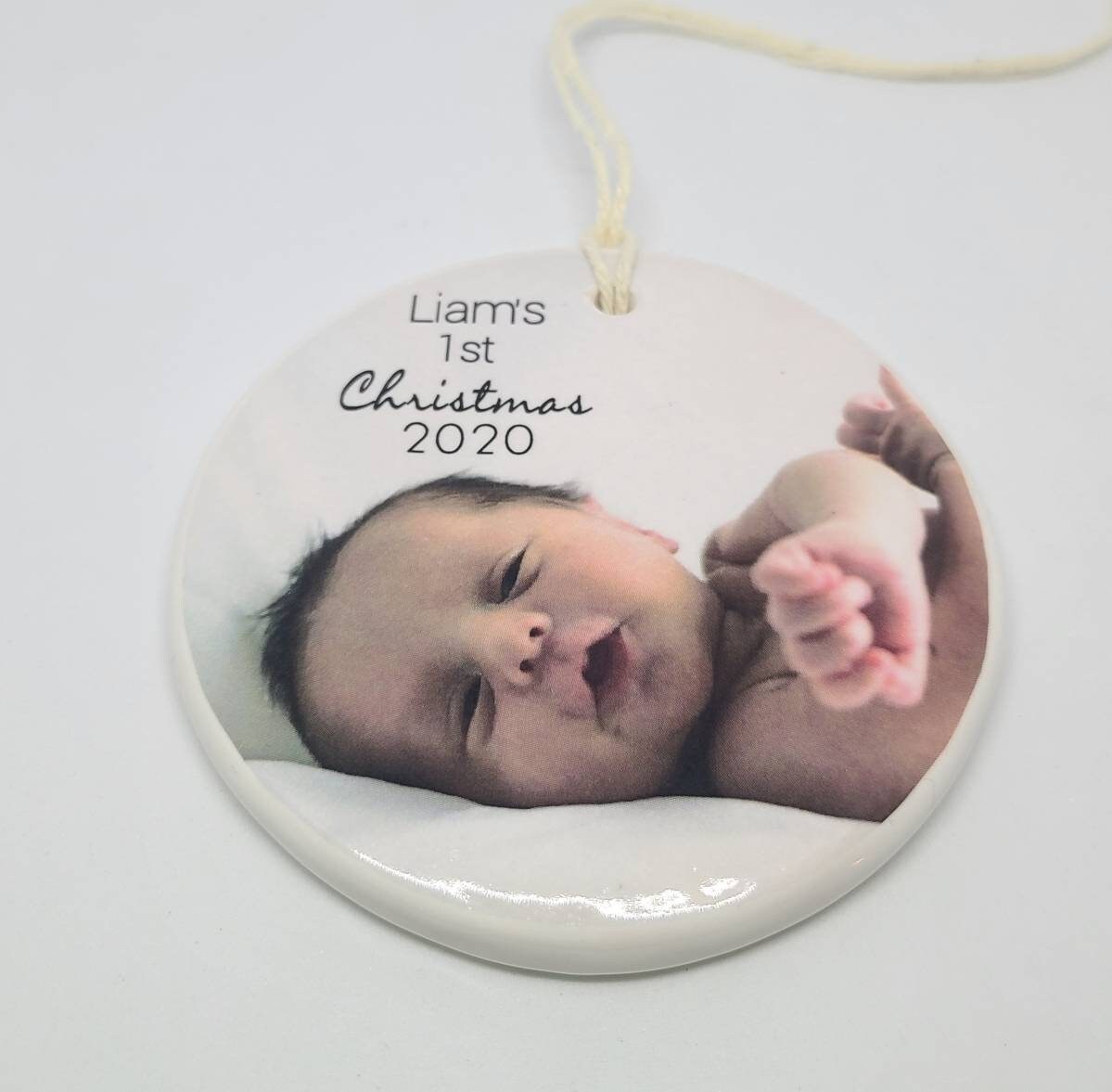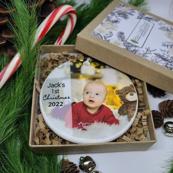 Have yourself a merry little First Christmas! Celebrate Baby's first Christmas with our personalized ceramic Christmas ornament featuring their photo, name and year. We use different designs to fit best with the photo and text you provide for us. You'll receive a draft to approve before we make your final piece. Can be shipped directly to the recipient.