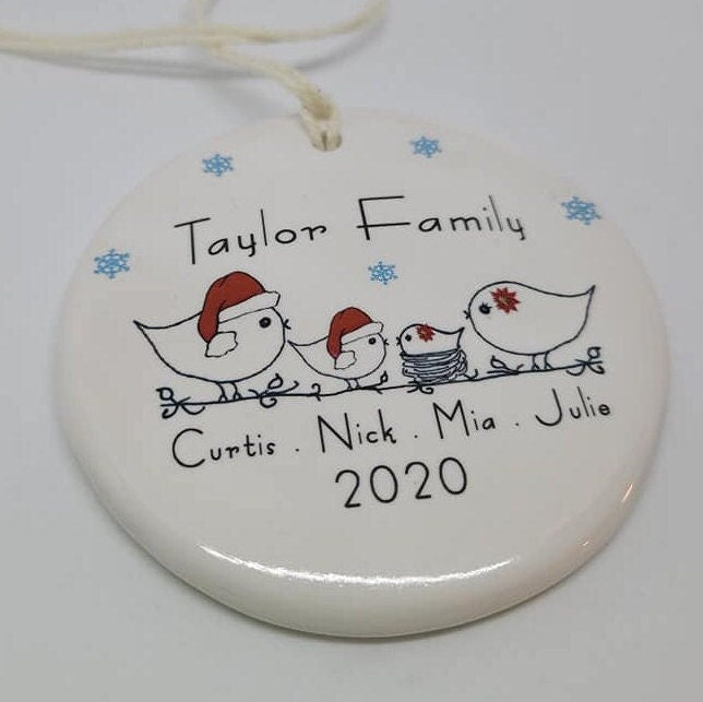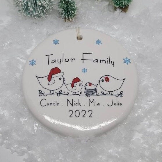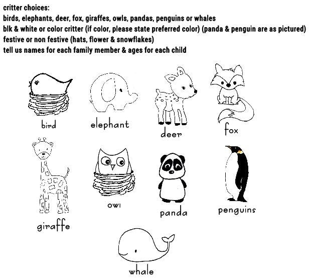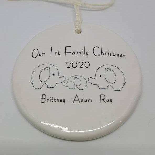 Sweet and simplistic, our adorable line drawn family ornaments are a perfect way to celebrate your little family. Your choice of critter with your names. You can have your Family's last name or Our 1st Family Christmas as the header. You'll receive a draft to approve before we make your final piece.