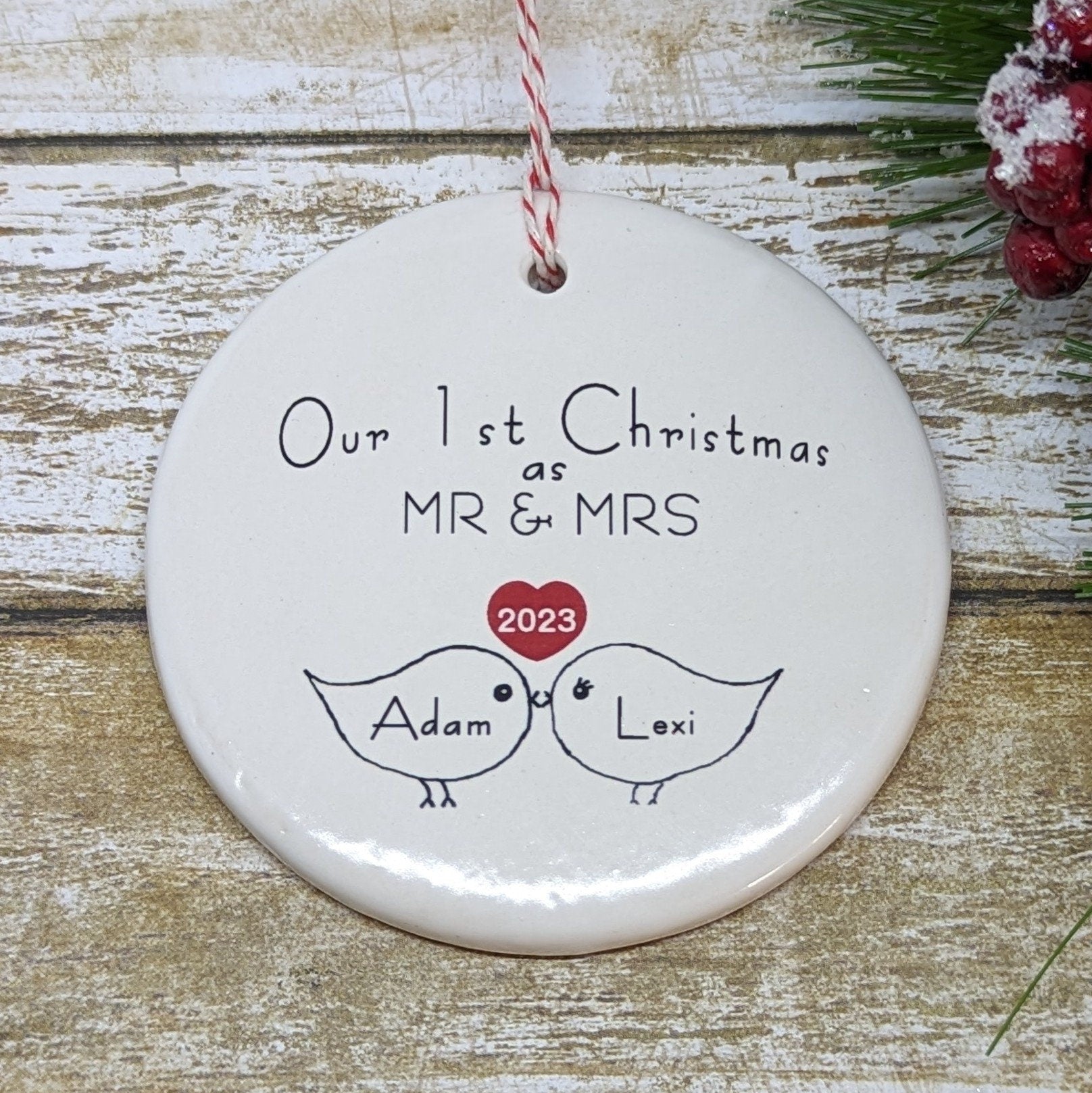 Just Married! Personalized line drawn Christmas ornament for the Newlyweds. Marking the beginning of your beautiful journey. Our Mr. and Mrs. ornament will be a special keepsake for years to come. Can me shipped directly to the recipient. Makes a wonderful Wedding or Engagement gift!
