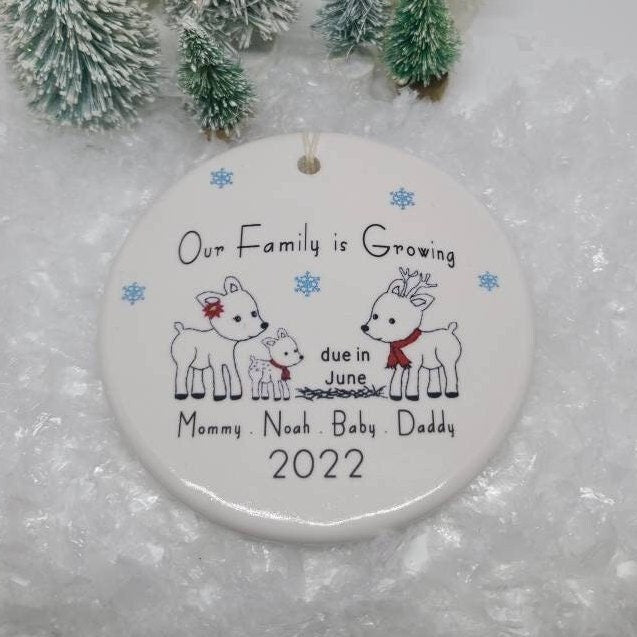 The ornament will have Our Family is Growing and personalized with your family's names plus when the baby is due. It will also have the Christmas year to always remember this special time in your family's story.