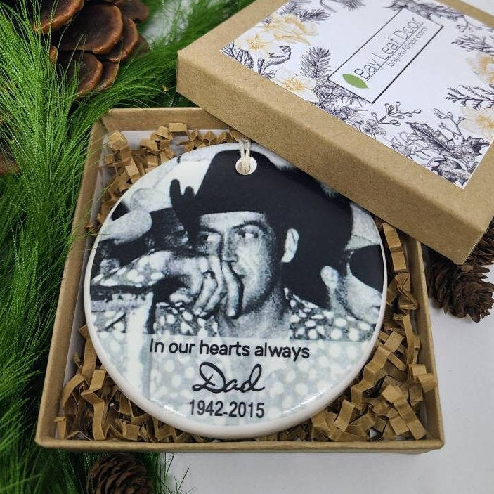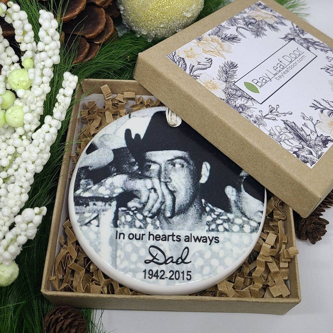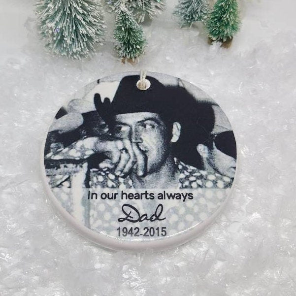 Their ornament will have a photo of their loved one with the loved one's name and dates (optional). We use different designs to fit best with the photo you provide for us. You'll receive a draft to approve before we make your final piece. Memorial ornaments can be shipped directly to the recipient.
