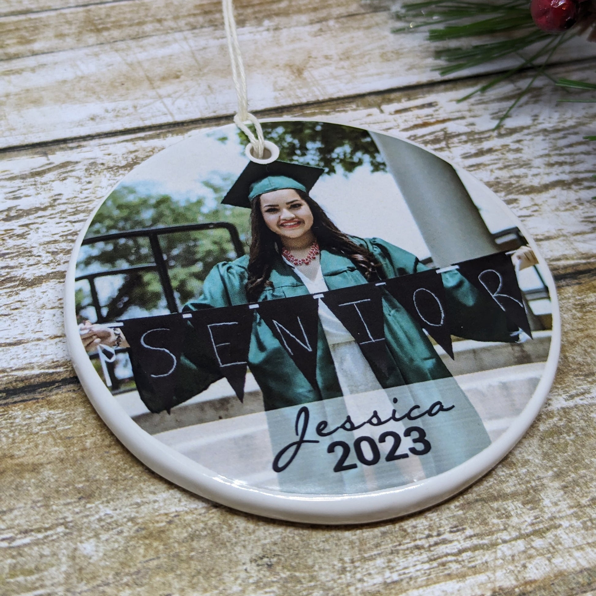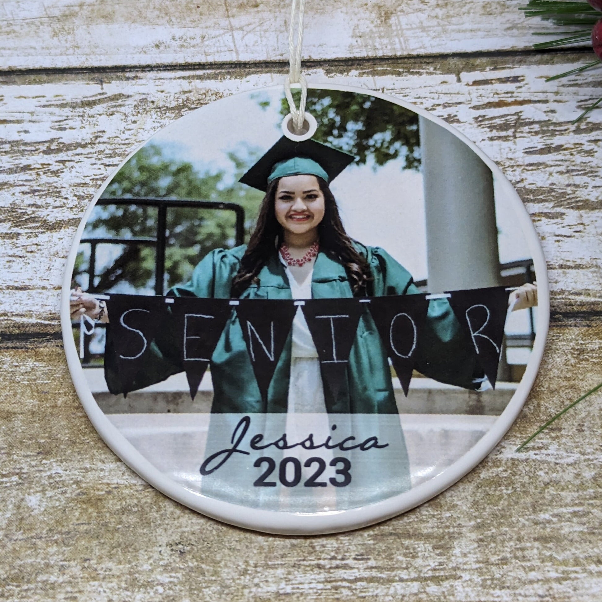Celebrate Seniors on their big accomplishment with our personalized ornament featuring their senior photo or a photo of your preference. Will have your photo with name and the year. We use different designs to fit best with the photo you provide for us. You'll receive a draft to approve before we make your final piece. Orders can be shipped directly to the recipient.