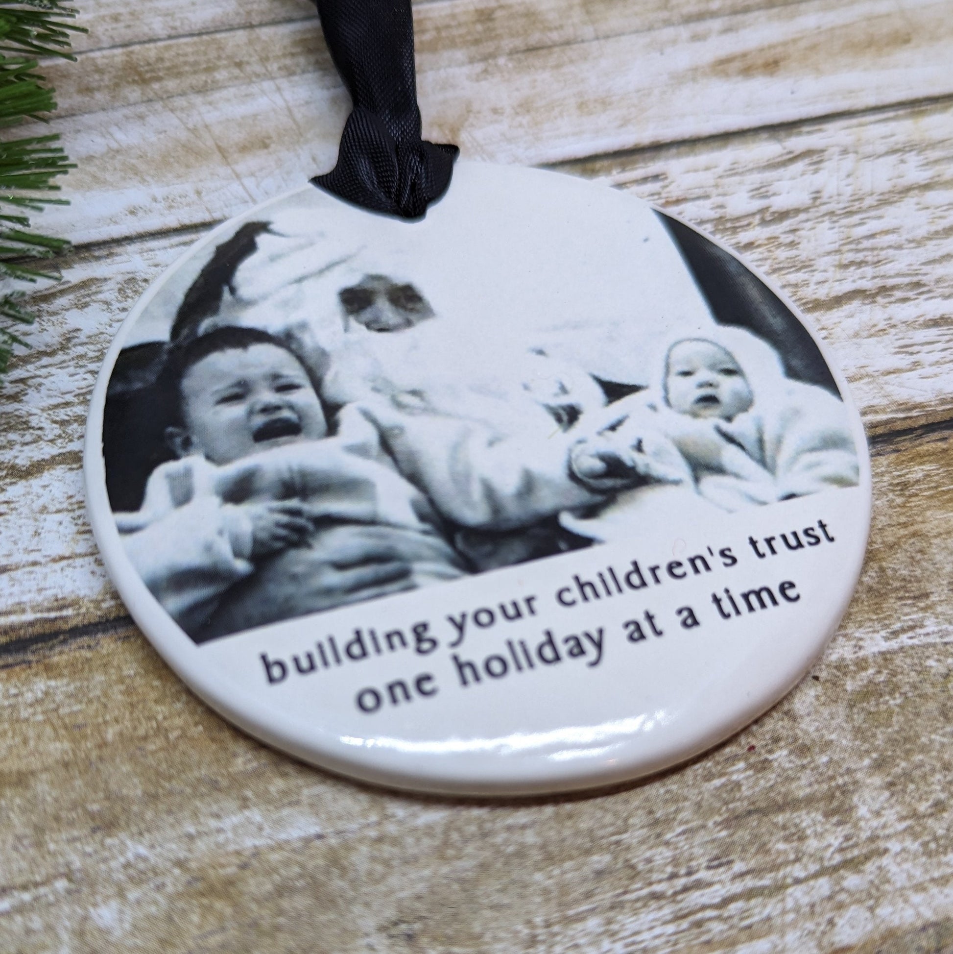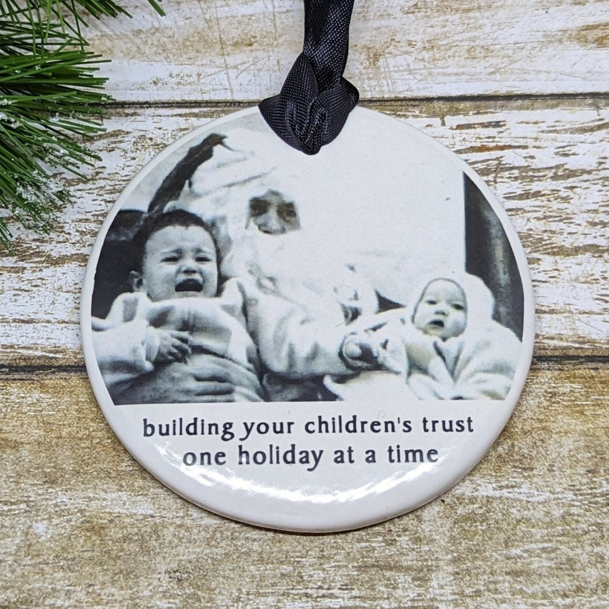 Some friends are always up to all sorts of shenanigans. They would most definitely be on the naughty list every year. Our vintage style Christmas ornaments are ceramic and perfect for hanging on your door or tree. They make great gifts as well.