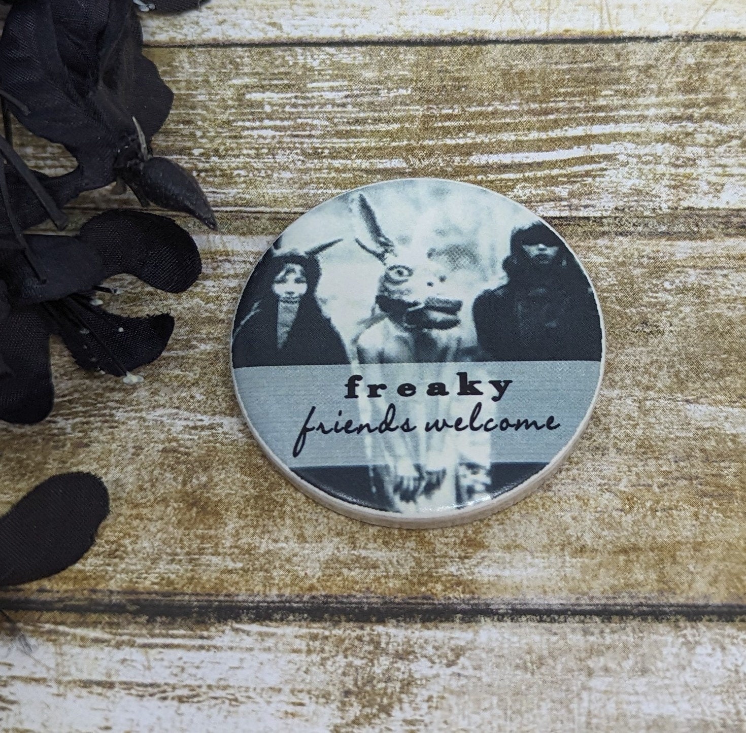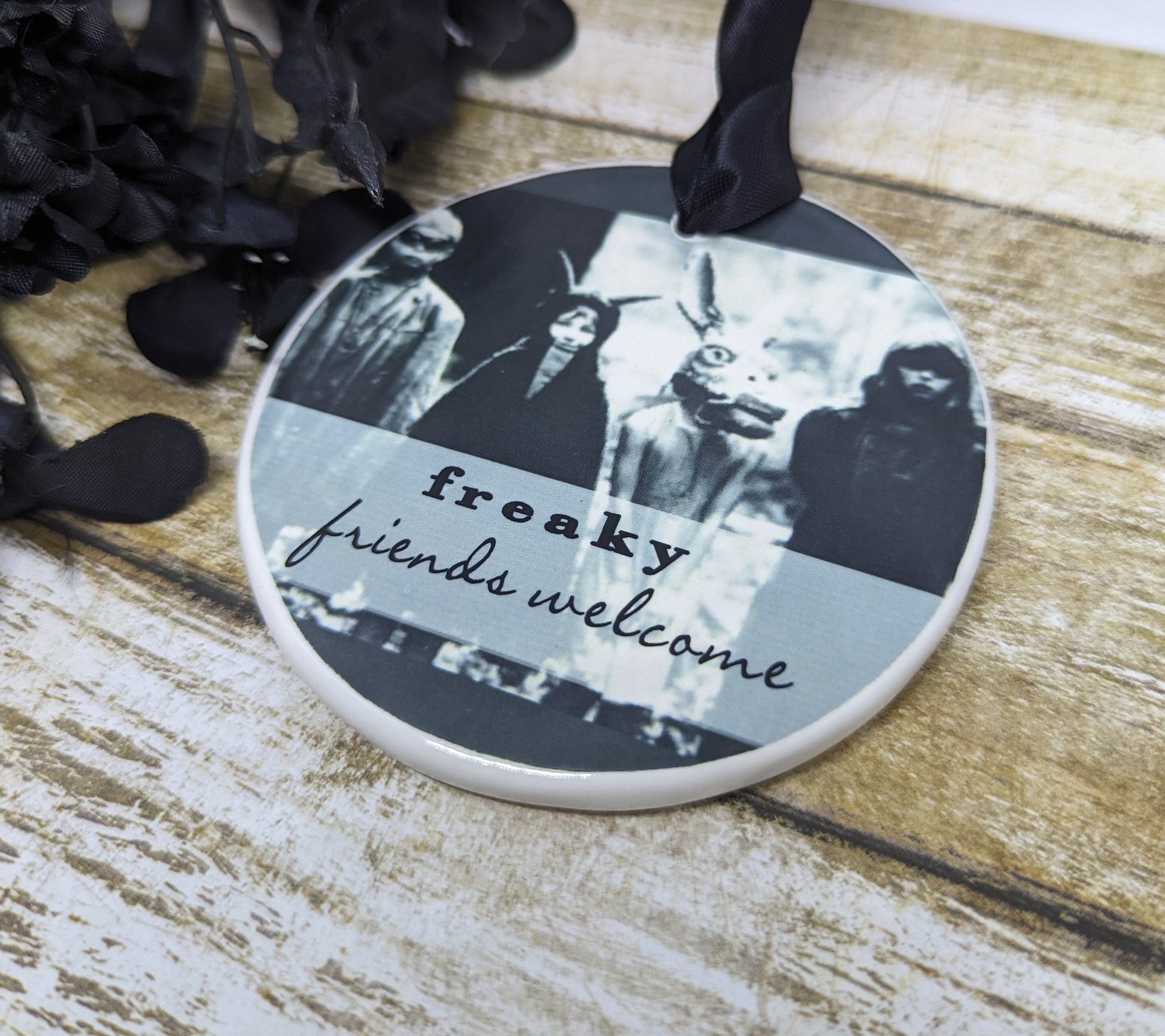 When you find your people it's priceless. Our freaky friends welcome sign measures just over 3" making it perfect to hang just about anywhere. Made of ceramic, it's charming and welcoming.