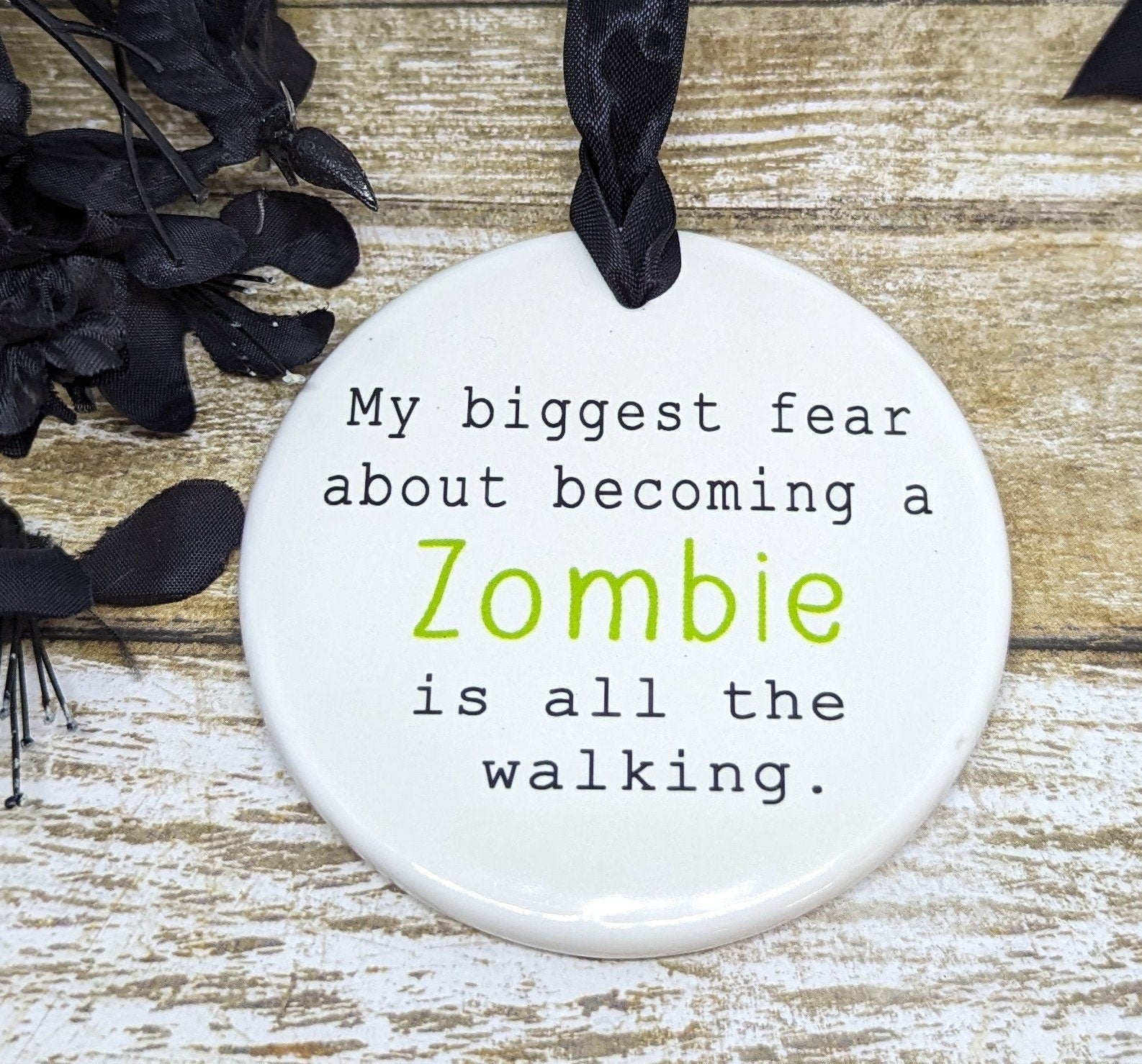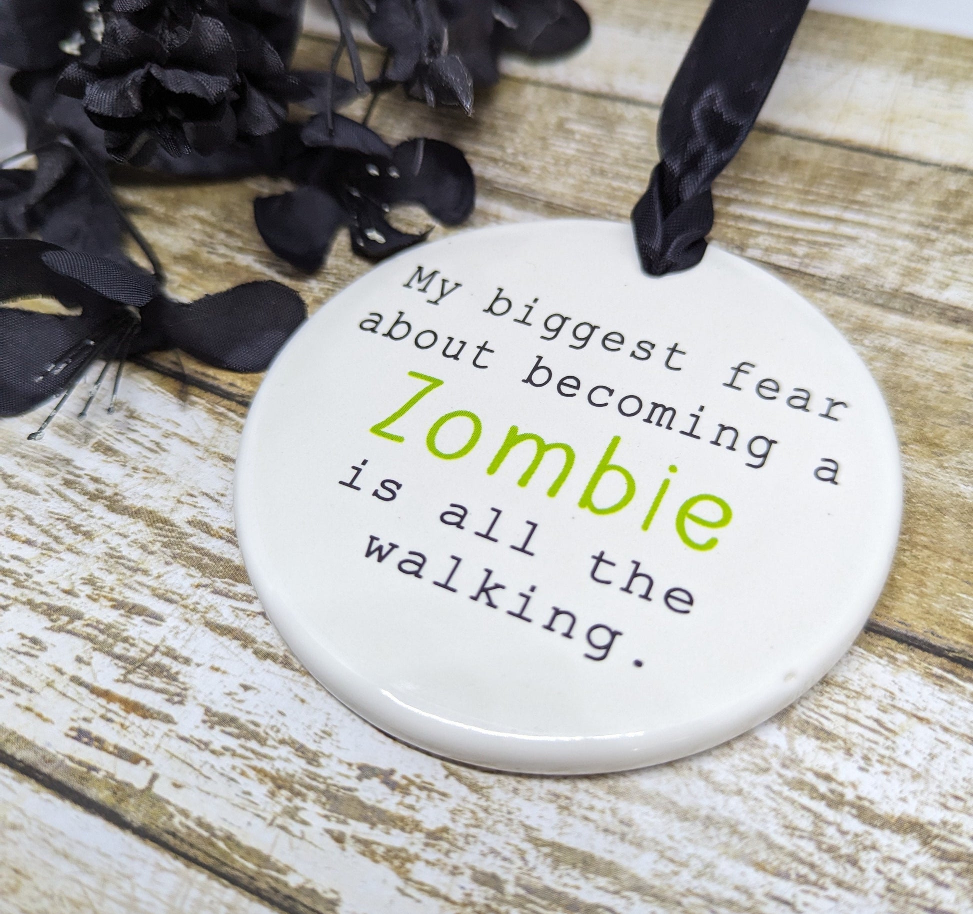 For all of the Zombie lovers out there. A funny sign about the fear of becoming a Zombie and all of the walking involved. Small and subtle, perfect for hanging just about anywhere.