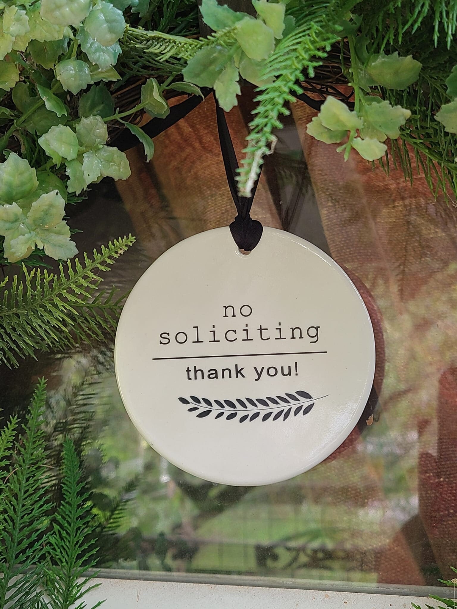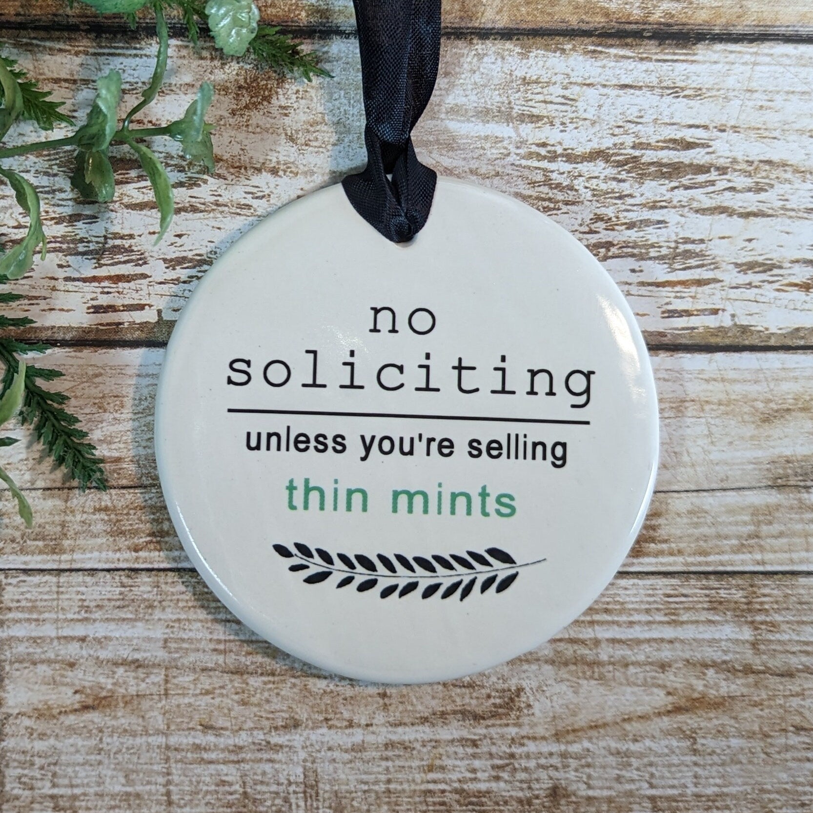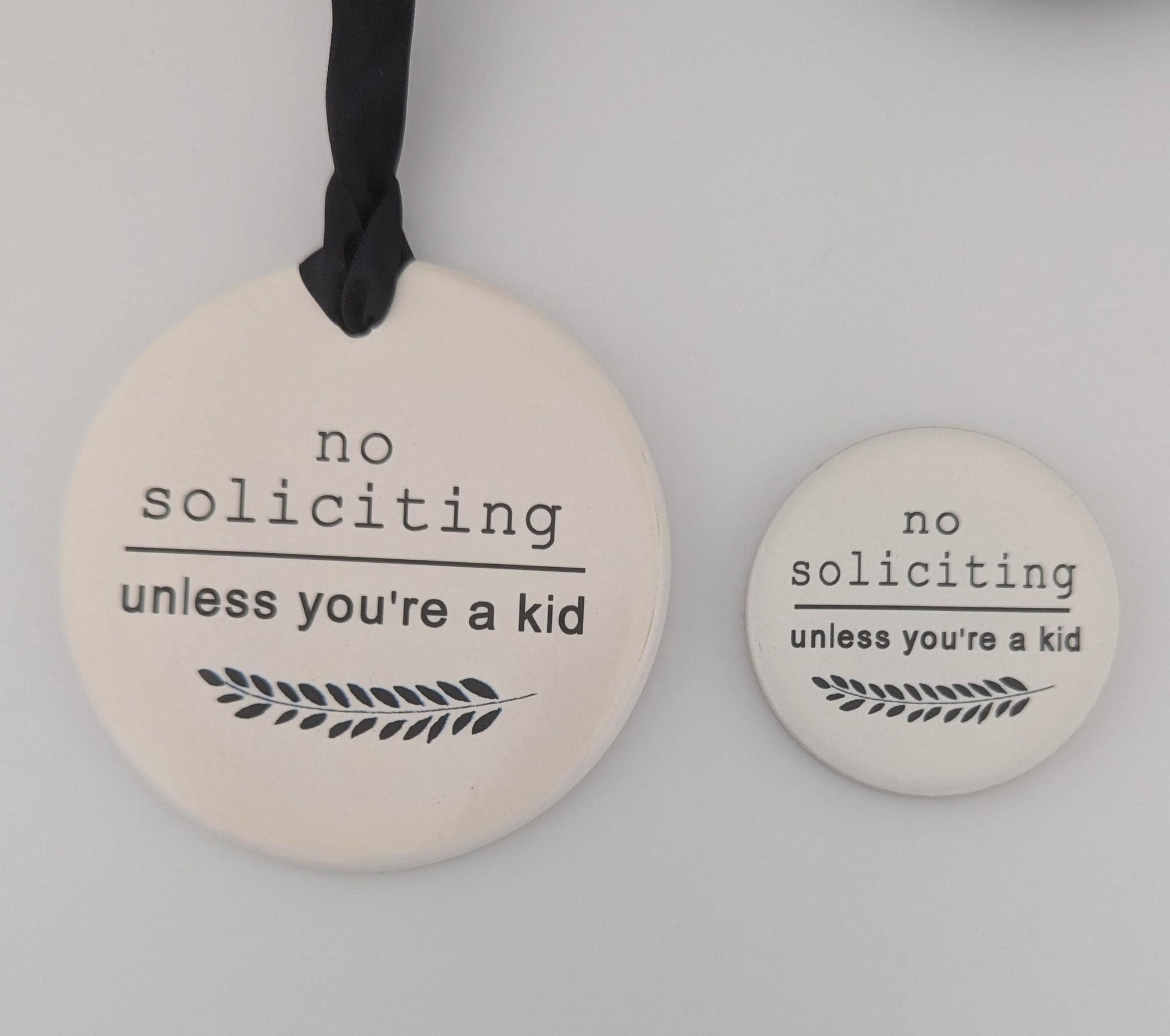 For a no soliciting sign that is still kid friendly, we've created our no soliciting unless you're a kid sign. So, when you don't want solicitation, but would still love school fundraising wrapping paper, these are the perfect solution. Our ceramic signs are small and elegant.