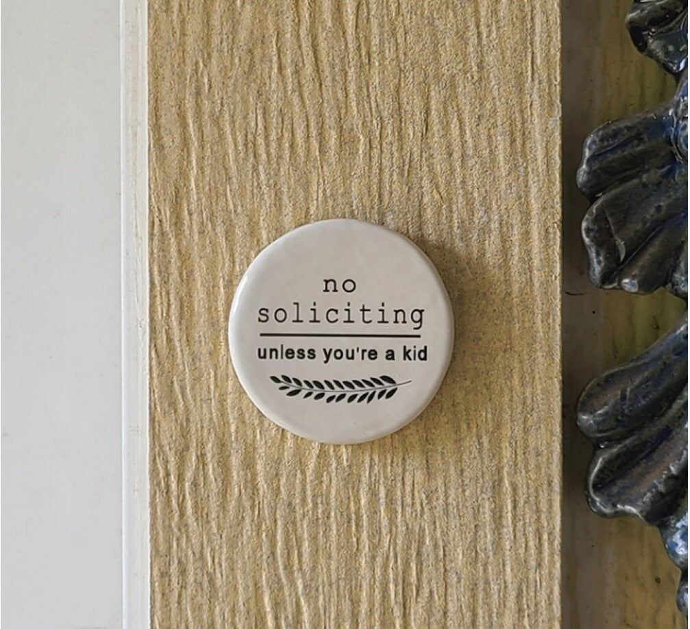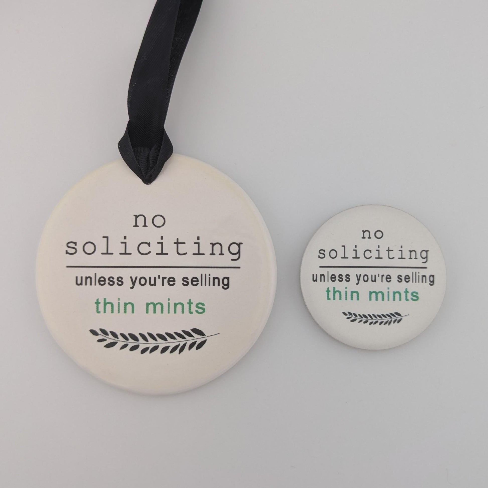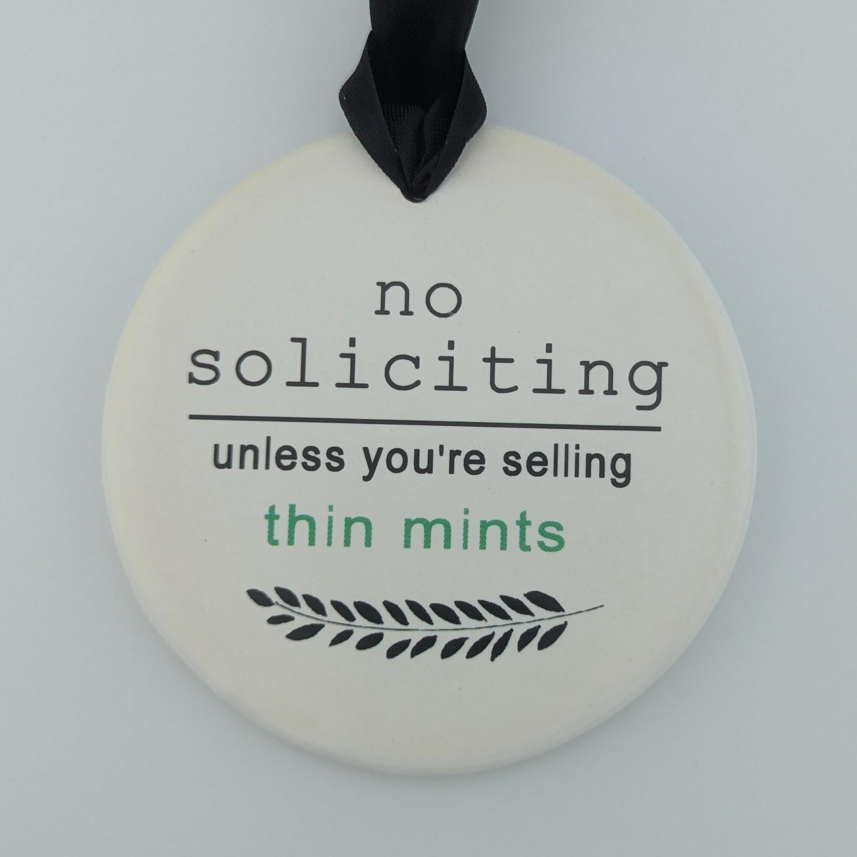 For a no soliciting sign that is still kid friendly, we've created our no soliciting unless you're selling thin mints sign. When you don't want solicitation but would still love to support kid's fundraising while enjoying some cookies, these are the perfect solution. Our ceramic signs are small and elegant.